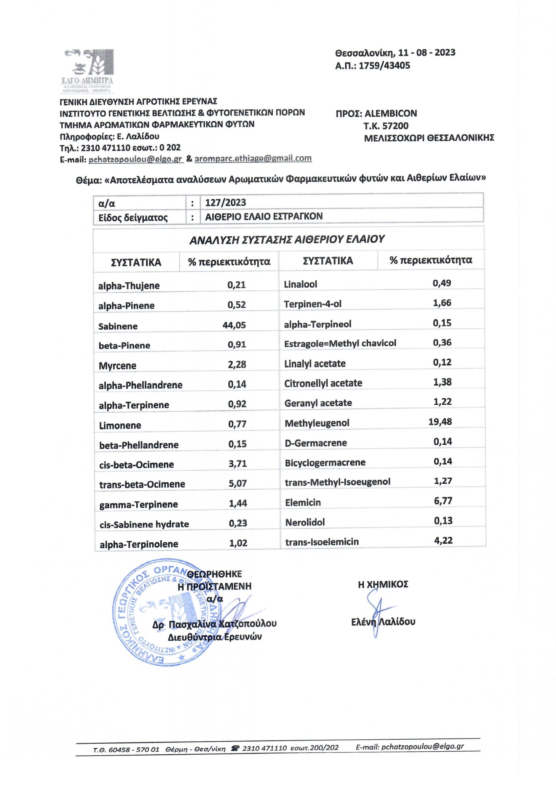 Σαβινένιο, μεθυλευγενόλη, ελεμικίνη, Trans-β-οκιμένιο, εστραγκόλη, λιμονένιο, λιναλοόλη